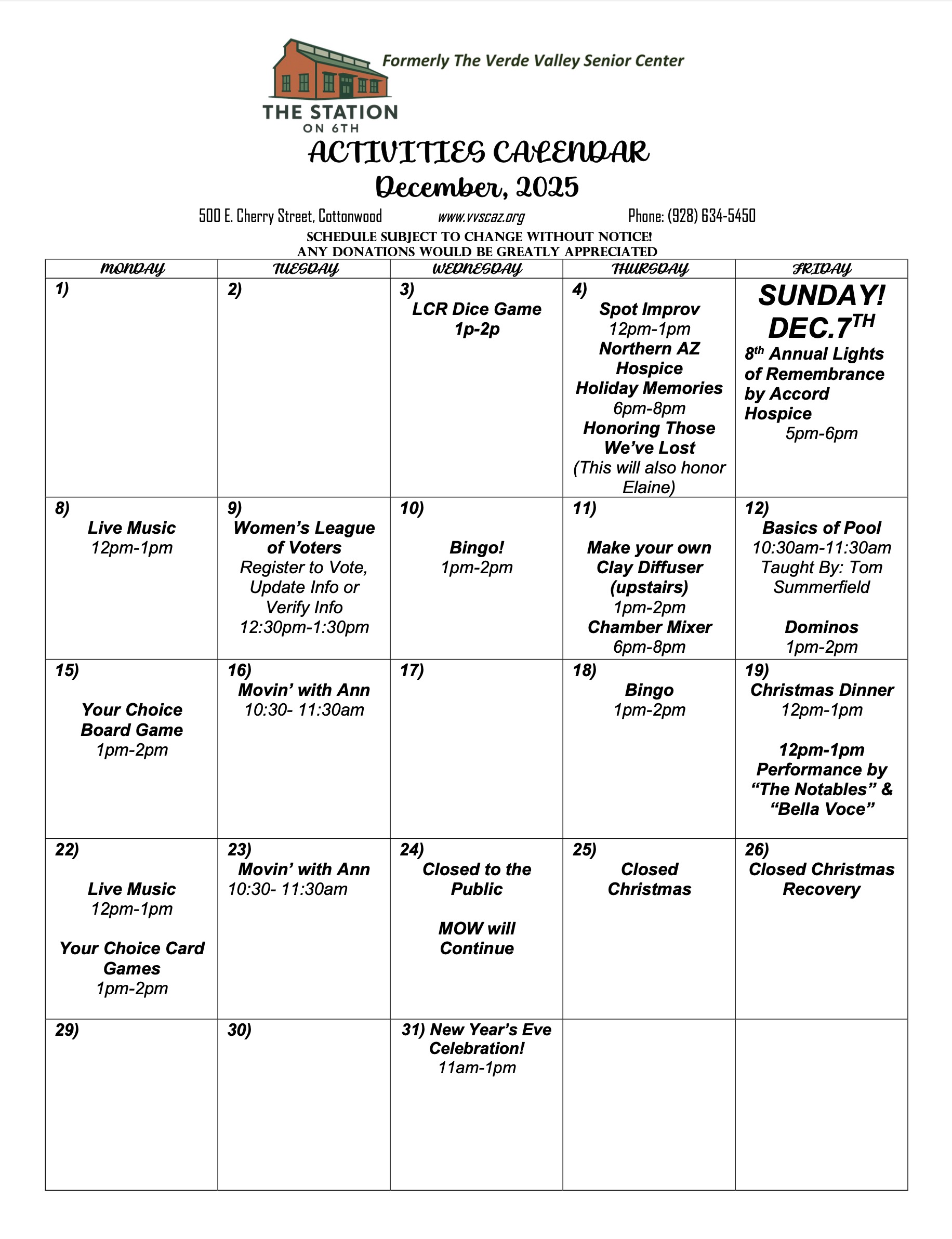 The Station on 6th is administered by The Verde Valley Senior Citizens Association 500 E. Cherry St., Cottonwood, AZ 86326